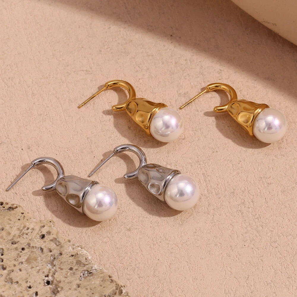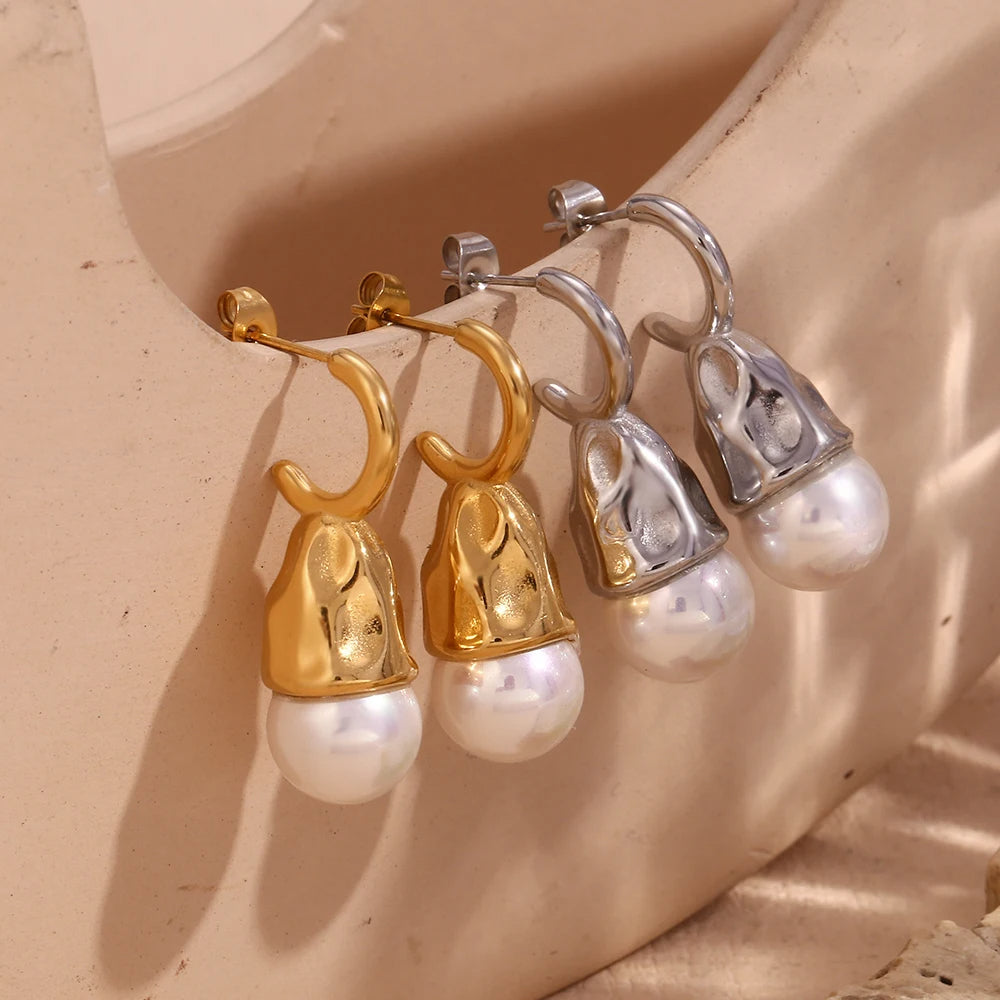 Pearl Droplet Earrings – where sculpted metal meets soft shimmer, these pieces frame luminous pearls in bold gold or silver, offering a look that’s both refined and contemporary.