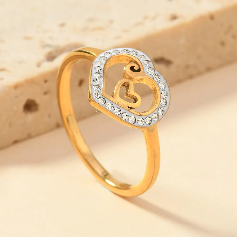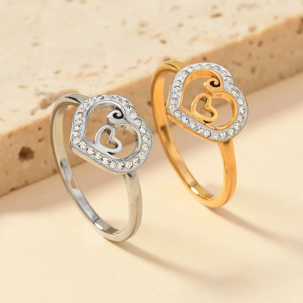 Stainless Steel Heart Ring – a playful dance of curves and sparkle, where a shimmering heart encloses another, echoing love within love on a band of enduring steel.